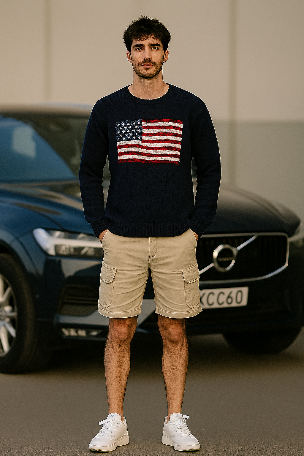 Com um visual marcante e atemporal, o Suéter USA Flag une a elegância do azul marinho ao destaque da bandeira dos Estados Unidos em tricô detalhado. Ideal para quem valoriza peças com personalidade, ele carrega uma estética clássica e uma pegada preppy, perfeita para elevar qualquer composição casual com atitude.